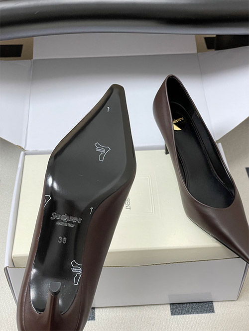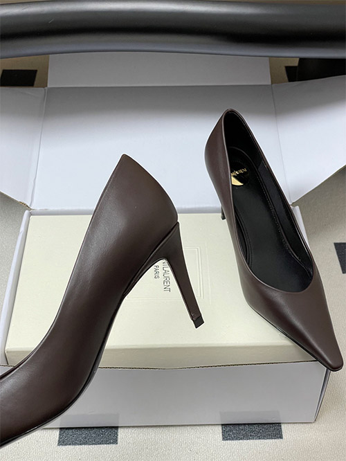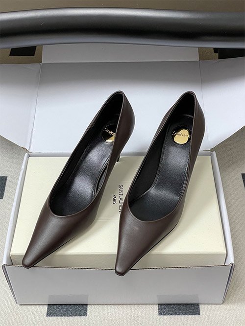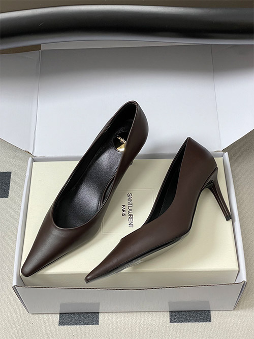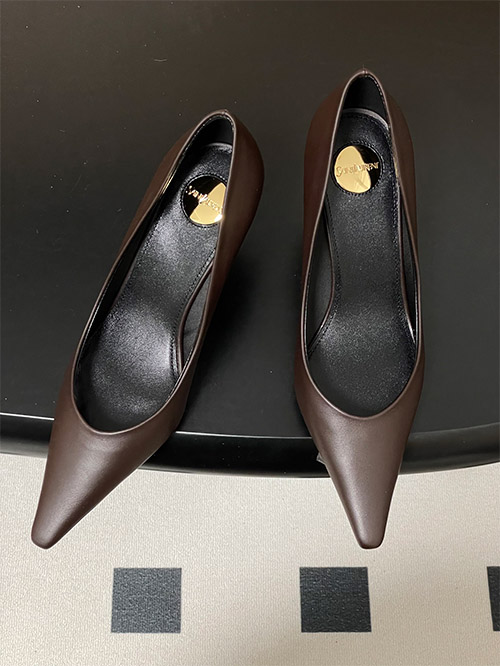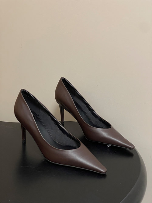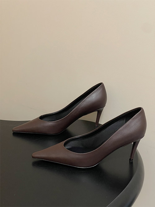 This style features a premium cow leather upper with a smooth, satin-like finish achieved through refined tanning processes. The soft sheepskin insole enhances comfort, while the Italian genuine leather outsole ensures durability and structural stability. The 7.5cm stiletto heel creates a sharp and elongated silhouette, and the pointed toe enhances precision and authority. The deep brown tone offers a sophisticated alternative to black, delivering warmth while maintaining a strong and premium visual presence.