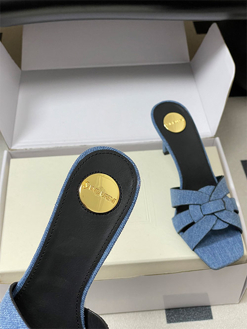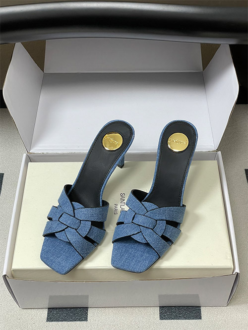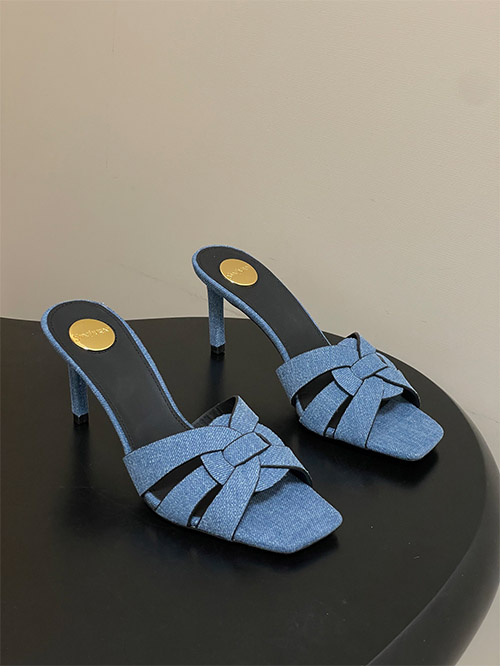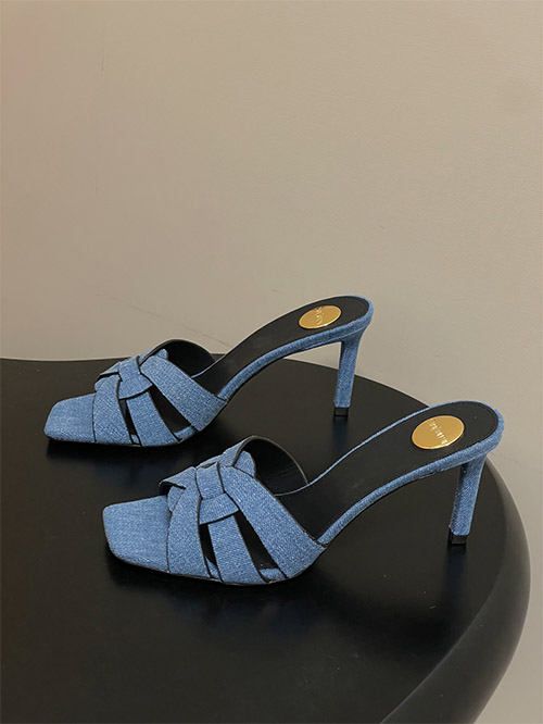 This YSL denim mule features a woven denim fabric upper with a hollow structure, providing breathability and lightweight comfort for daily wear. The square toe enhances a clean, modern silhouette, while the slim heel delivers balanced elevation.